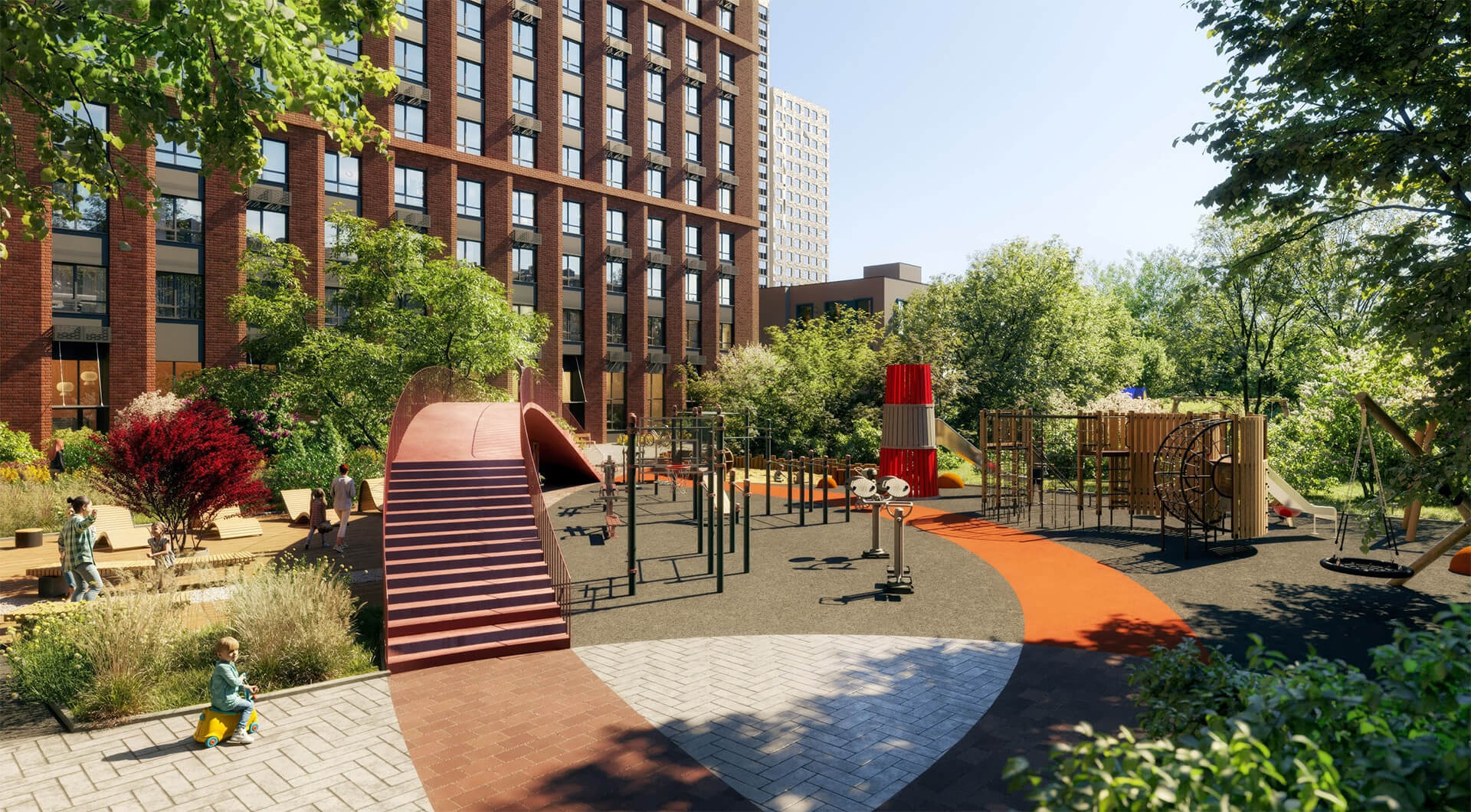 Детские игровые и спортивные площадки рассчитаны на разные возрастные группы и виды активности: от классических качелей до скалодромов и воркаут-зон для подростков. Прямой выход во двор из начальной школы и детского центра обеспечивает безопасность и спокойствие родителей. В зоне присутствует безбарьерная среда, что делает дворовое пространство доступным для всех жителей, включая людей с ограниченными возможностями.