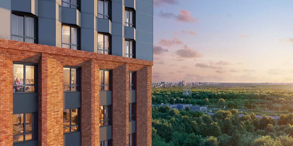 Монолитно-кирпичное строительство с вентилируемой фасадной системой сочетает долговечность и энергоэффективность, а безбарьерная среда, сквозные подъезды и корзины для кондиционеров встроены в концепцию комплексной жилой среды. Система окон высотой 1,8 м и потолки до 3,65 м обеспечивают панорамные виды на город и лесопарк, создавая чувство единения с окружающей природой и расширения пространства внутри квартиры.