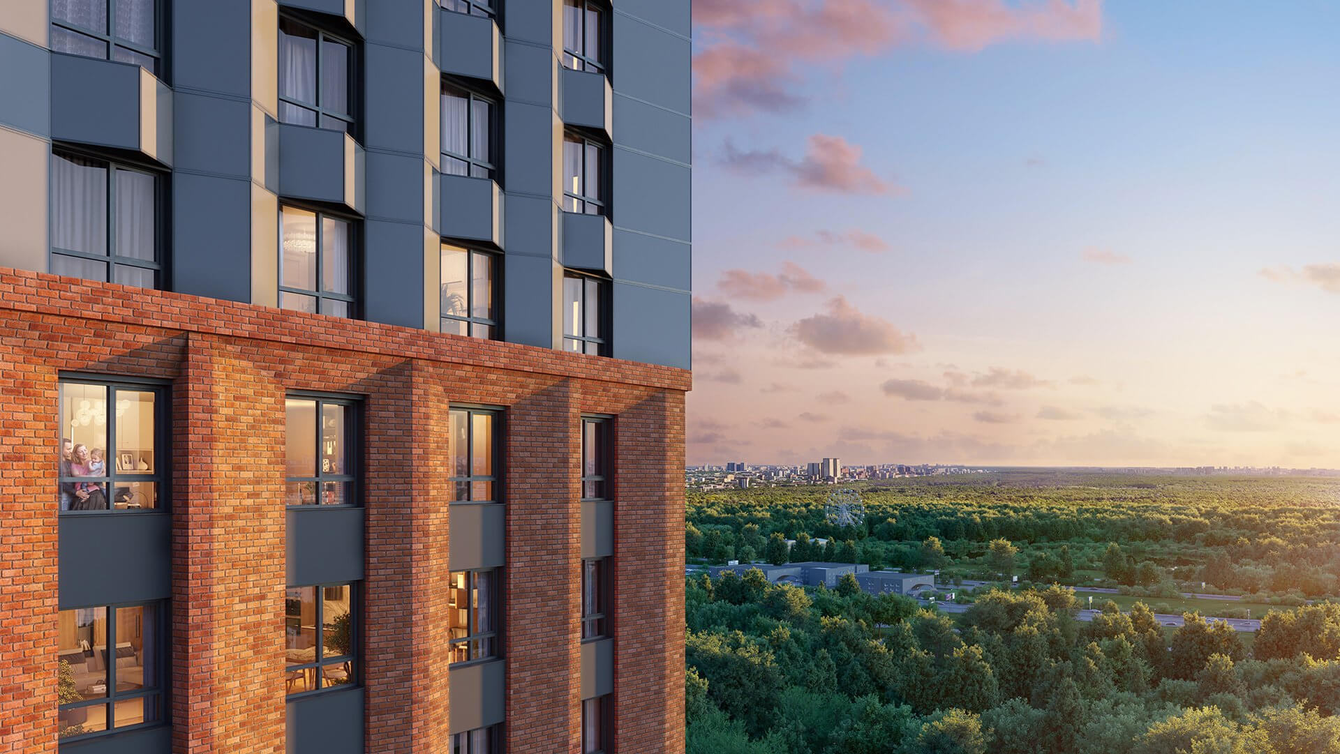 Монолитно-кирпичное строительство с вентилируемой фасадной системой сочетает долговечность и энергоэффективность, а безбарьерная среда, сквозные подъезды и корзины для кондиционеров встроены в концепцию комплексной жилой среды. Система окон высотой 1,8 м и потолки до 3,65 м обеспечивают панорамные виды на город и лесопарк, создавая чувство единения с окружающей природой и расширения пространства внутри квартиры.