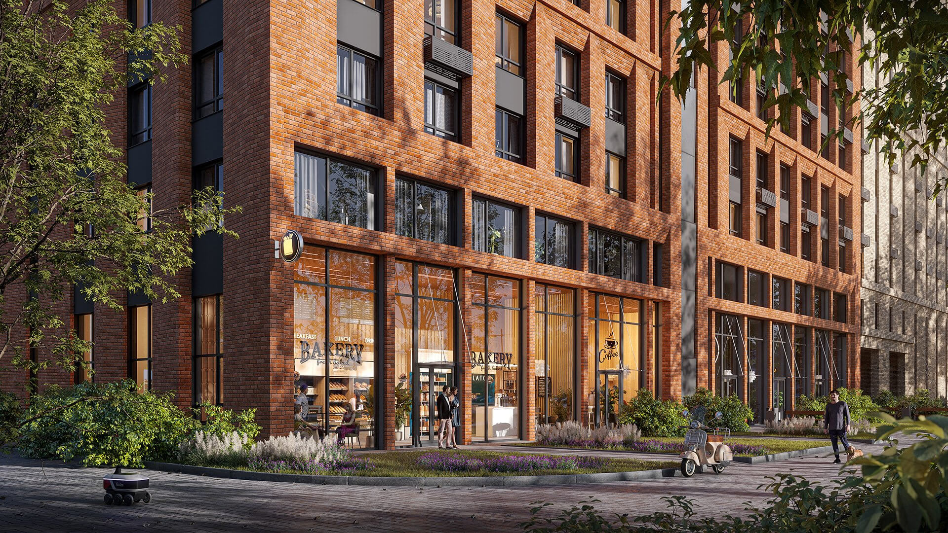 На первых этажах предусмотрены коммерческие помещения, где разместятся магазины, кафе, салоны красоты, фитнес-студии и необходимые повседневные сервисы. Благодаря этому, всё необходимое будет находиться в шаговой доступности — без необходимости покидать периметр комплекса. Также внутри проекта создаются собственные муниципальные детский сад и начальная школа, что делает локацию особенно удобной для семей с детьми.