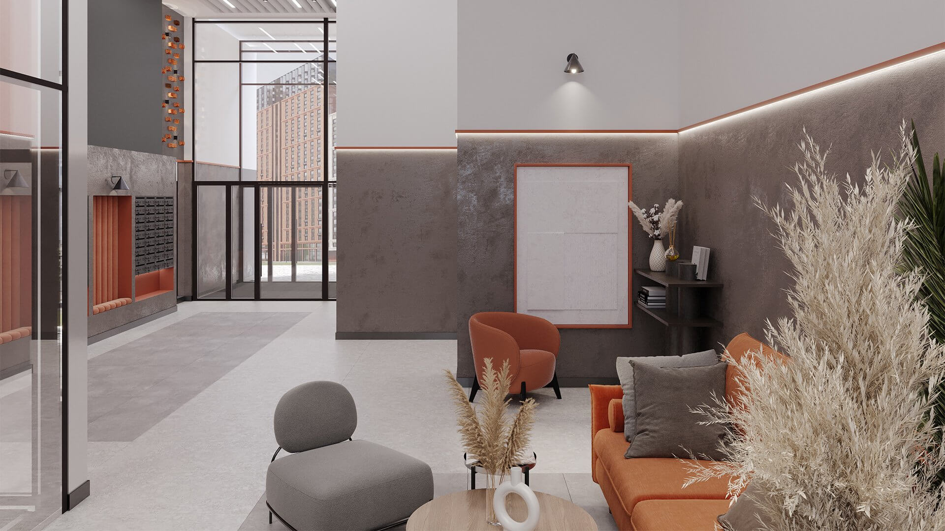 Дизайнерская отделка, качественные материалы и практичная эргономика соединены в единую концепцию, которая подчеркивает комфорт и функциональность. Ресепшен в лобби работает в режиме информационной поддержки жителей, а наличие колясочных и гостевых санузлов позволяет создавать сервис уровня премиум-комплекса. Внутренний интерьер лобби гармонично переходит в атмосферу всего комплекса, формируя ощущение целостности и продуманности пространства.
